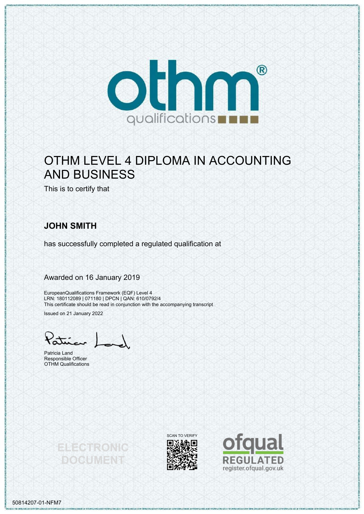 Level 4 Diploma Sample Certificate and Transcript