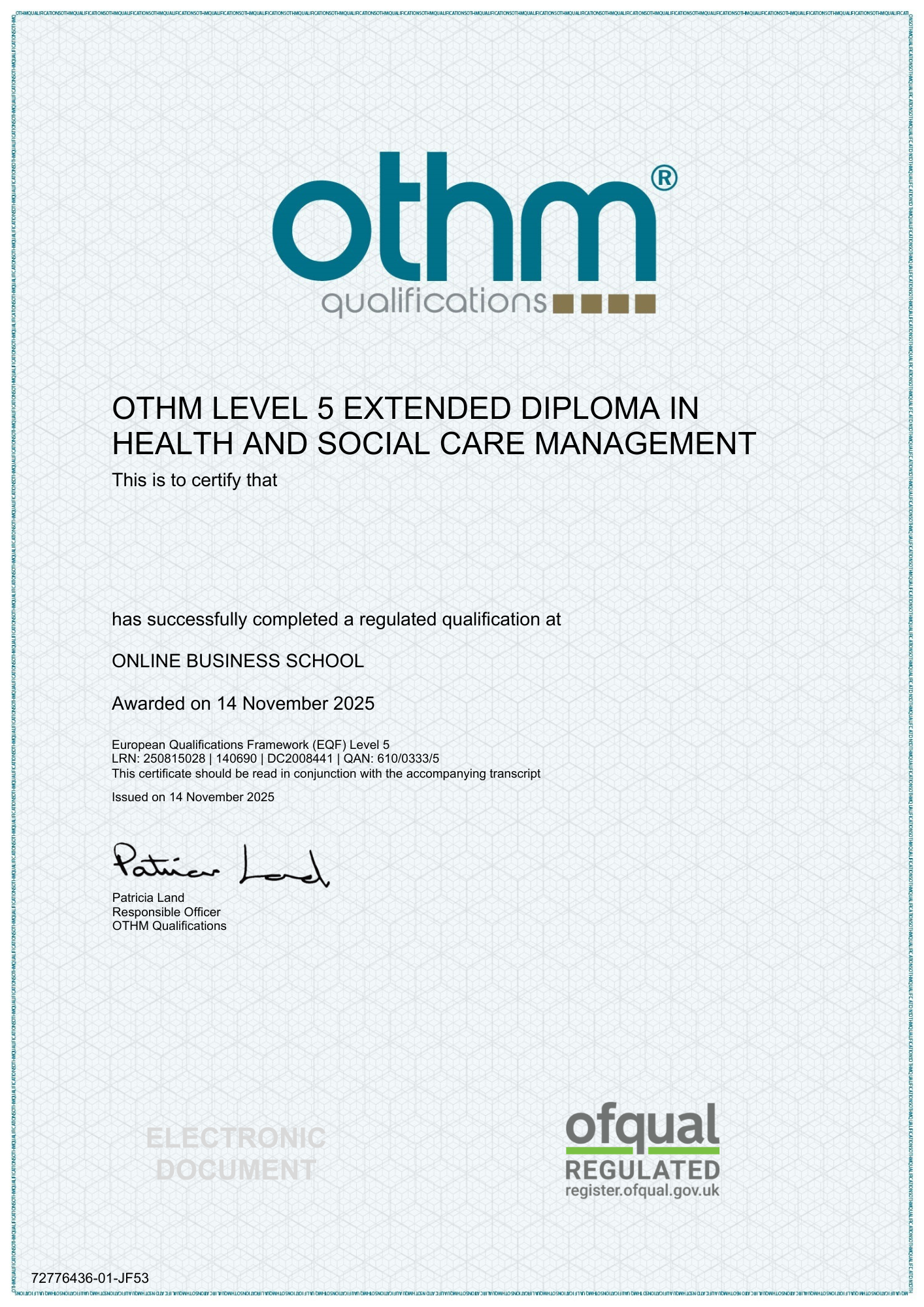 OTHM Level 5 Extended Diploma – Sample Certificate and Transcript